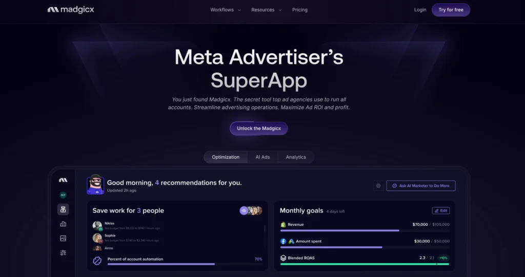 Madgicx is an omnichannel marketing platform that uses AI tags, creative insights, custom automation, and campaign overviews to enable solopreneurs and enterprises of all sizes to manage ad optimization.