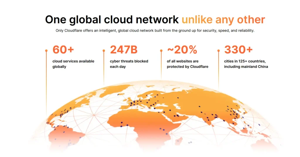Cloudflare operates a global CDN that caches your website content across numerous data centers worldwide. This reduces latency by serving content from locations closest to your visitors, improving load times and user experience.