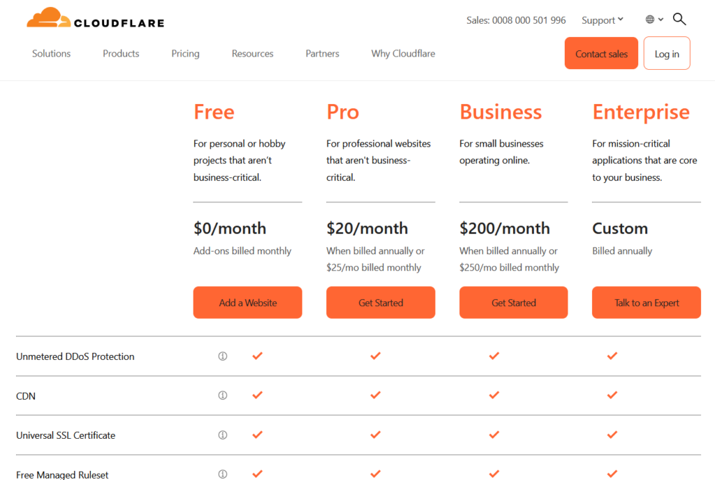 | Free | $0/month | Basic DDoS protection, CDN, shared SSL, and global CDN. |