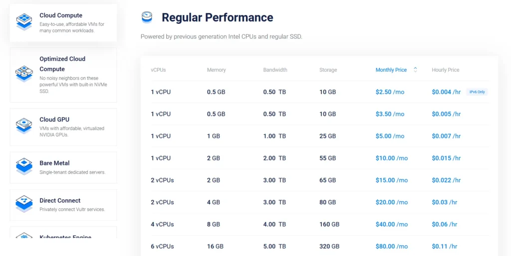 Cloud Compute Instances: Vultr provides a wide range of cloud compute instances, including standard compute for general workloads, high-frequency compute with faster CPUs and NVMe storage for performance-heavy applications, optimized compute instances for specific CPU or memory-intensive tasks, bare metal servers for complete control over physical hardware, and cloud GPUs for machine learning and AI applications.