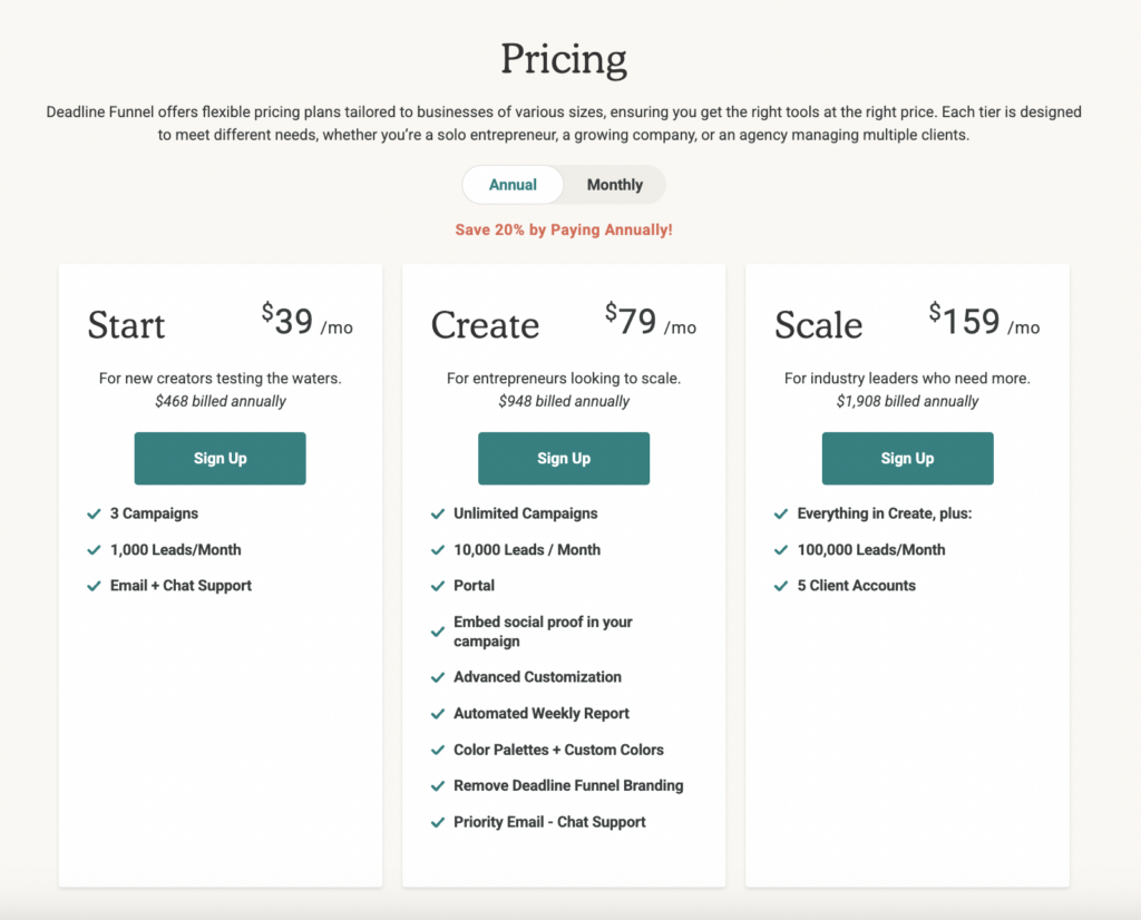 Deadline Funnel offers multiple pricing plans to fit different business needs. The “Start” plan is the most basic, allowing for up to three campaigns, while the “Create” plan offers unlimited campaigns and additional customization options. Pricing varies based on the number of leads you manage per month, and you can save 20% by choosing an annual plan.