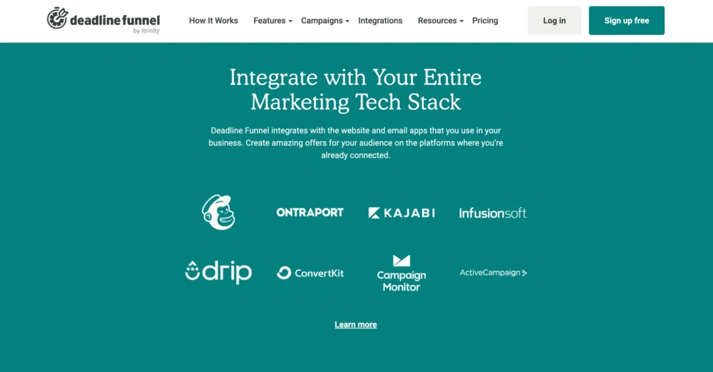 Deadline Funnel integrates directly with ActiveCampaign, Actionetics, AW Pro Tools, ConvertKit, Drip, HubSpot, Infusionsoft, Klick-Tipp, MailChimp, and Ontraport.