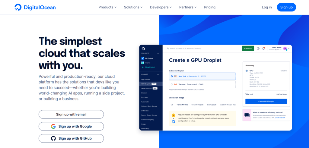 It offers a simplified process for starting databases, storage, networking, virtual machines (also known as “Droplets”), and more. It is notable for its straightforward pricing, easy-to-use interface, and simplicity.