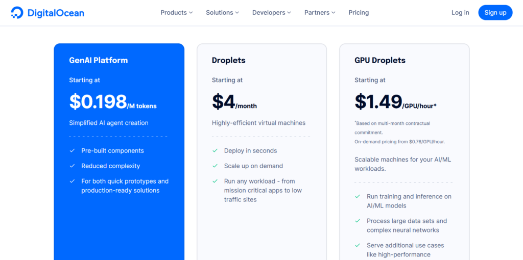 DigitalOcean’s core offering, Droplets, are scalable virtual private servers (VPS) that can be customized to meet various computing needs. They come with various CPU, memory, and storage configurations. Droplets are easy to deploy and manage, making them perfect for developers, small businesses, and startups.