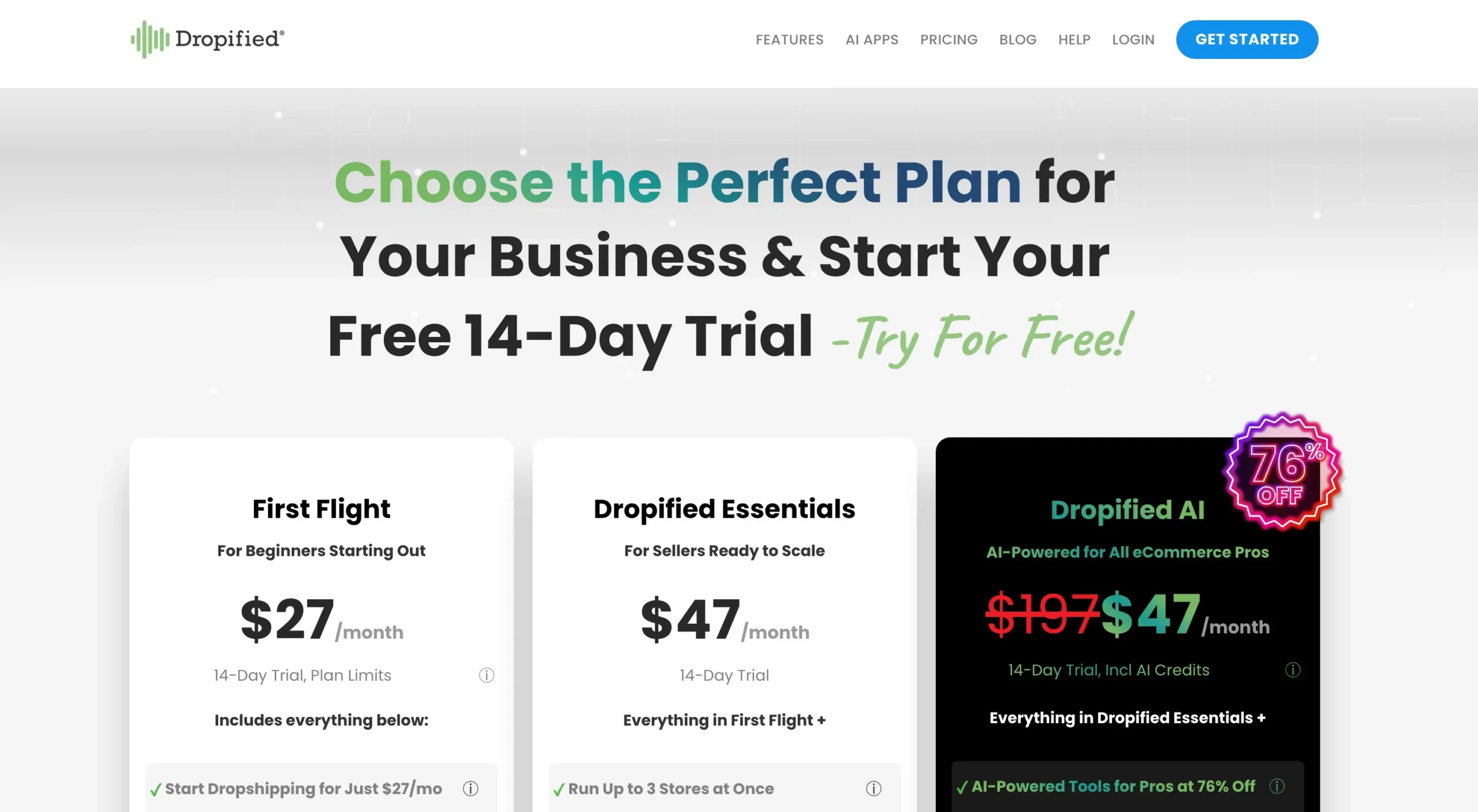 Dropified offers various pricing tiers, including a lifetime free plan for product research and a free trial to test its full capabilities.