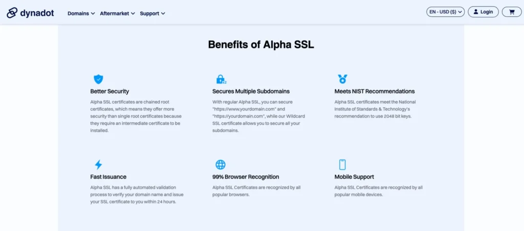 Alpha SSL Certificates are trusted by all major web browsers, ensuring widespread compatibility.