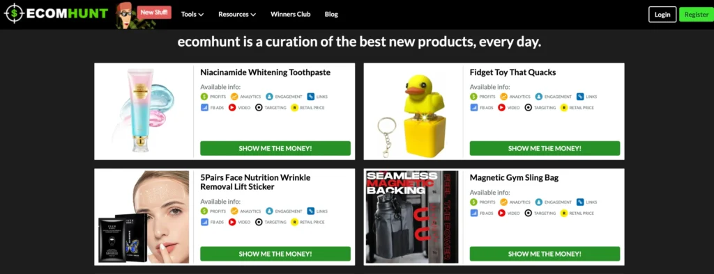 Ecomhunt helps users find profitable and trending products to sell. The platform curates a daily list of winning products, complete with analytics and insights.