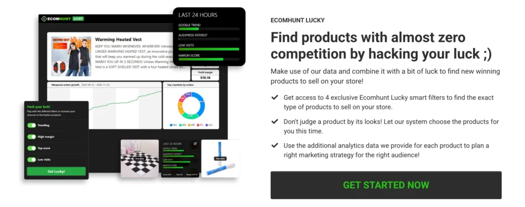 Fast and easy product ideas can be generated with Ecomhunt Lucky’s one-click feature. Ecomhunt has a few unique characteristics.