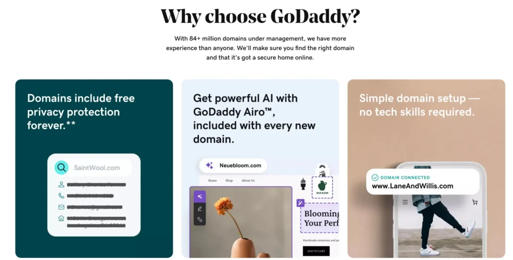 GoDaddy isn’t just about domain names. They offer hosting services, SSL certificates, professional email, website builders, and more.