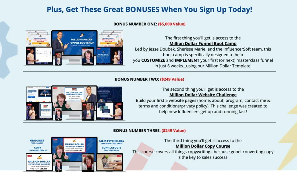 Get exclusive access to the Million Dollar Funnel Boot Camp, led by Jesse Doubek, Sherisse Marie, and the InfluencerSoft team. This boot camp is designed to help you customize and implement your first (or next) masterclass funnel in just 6 weeks using our proven Million Dollar Template!