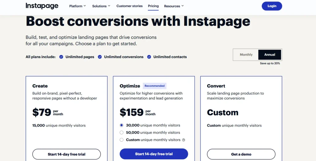 | Create | $99 ($79 with annual billing) | 15,000 | Drag-and-drop builder, reusable page blocks, real-time visual collaboration, triggered popups and sticky bars, AI content generation |