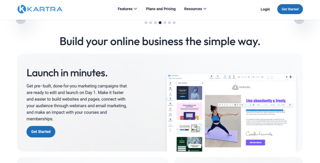 - Ease of Use: Kartra’s drag-and-drop interface makes it simple to build funnels, landing pages, and emails without needing advanced technical skills.