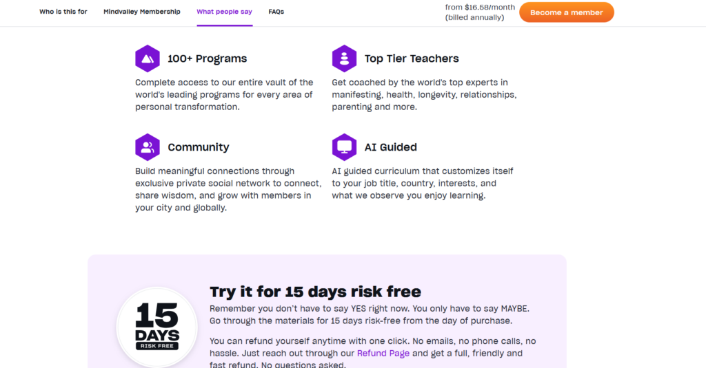 Mindvalley offers a 15-day risk-free trial, allowing you to explore the platform and experience its offerings before committing to a full membership.