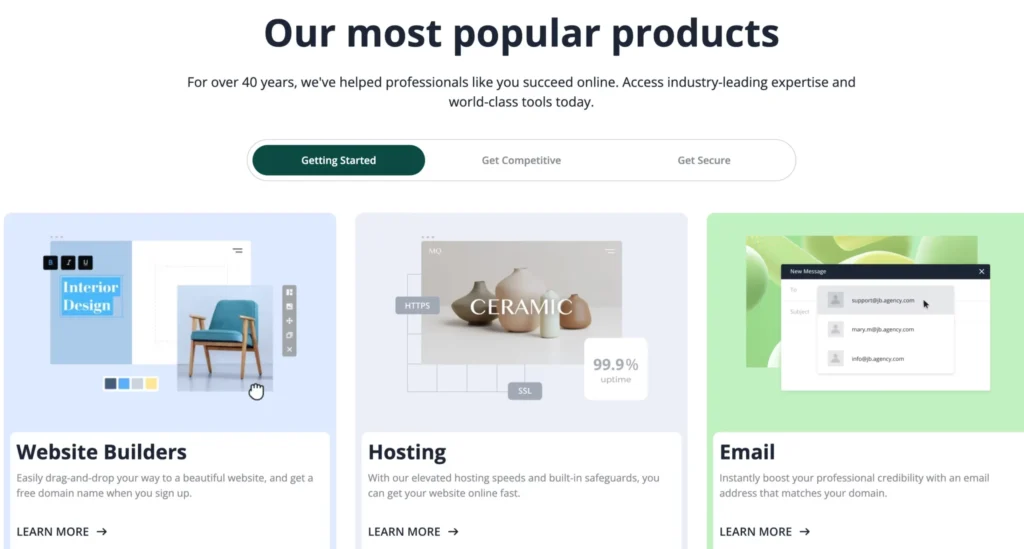 Network Solutions is recognized as a one-stop shop for domain registration, website building, and hosting, backed by decades of expertise.