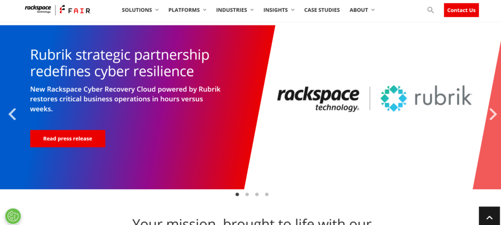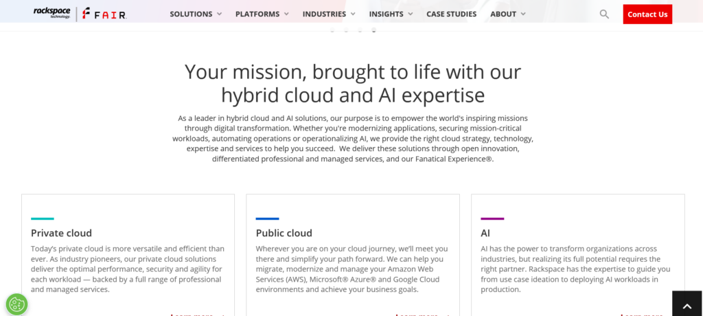 Rackspace helps you manage your cloud servers. You can also avail of their cloud providers’ service and experience excellence in other platforms like Amazon Web Services, Microsoft Cloud, Azure, or OpenStack.