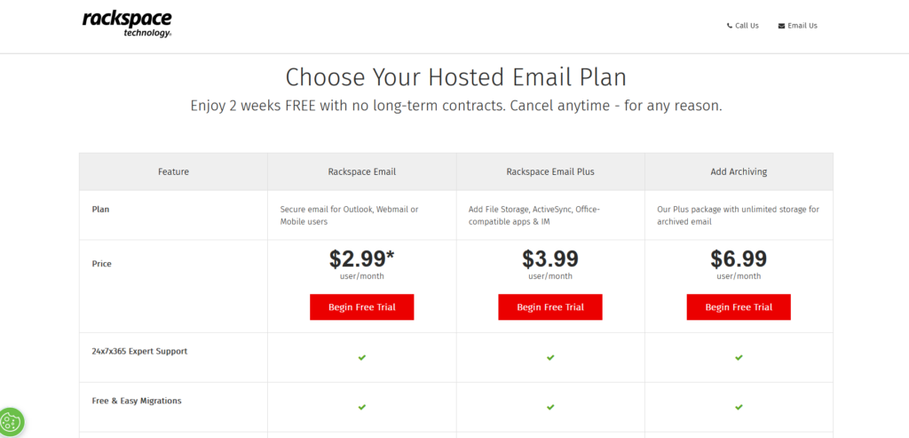 | Rackspace Email | $2.99/user/month | 25GB mailbox, 24/7 support, Outlook & mobile access, spam & virus protection |