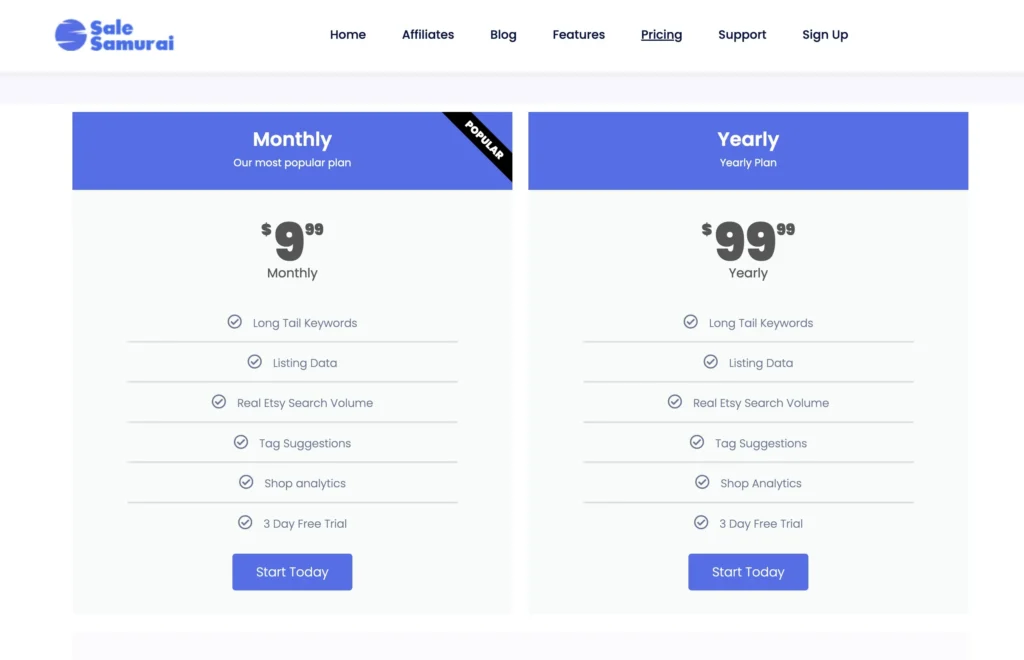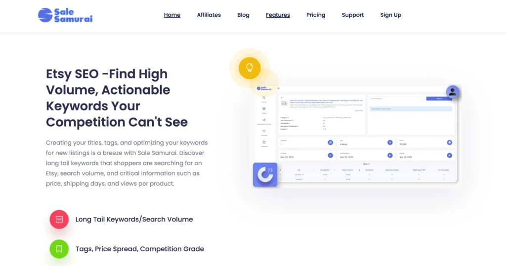 Sale Samurai is an effective Etsy SEO and keyword research tool designed to help sellers boost visibility and sales. With its powerful features for keyword analysis, competitor tracking, and listing optimization, it’s a valuable tool for Etsy entrepreneurs looking to grow their business.