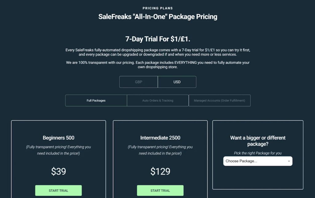 SaleFreaks offers a variety of pricing plans designed for eBay dropshipping automation, with flexibility to suit different user needs.