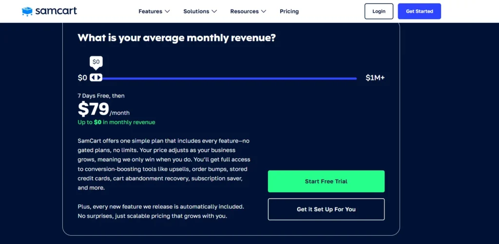 SamCart offers a straightforward pricing model with a single plan that includes all features. Here’s a breakdown: