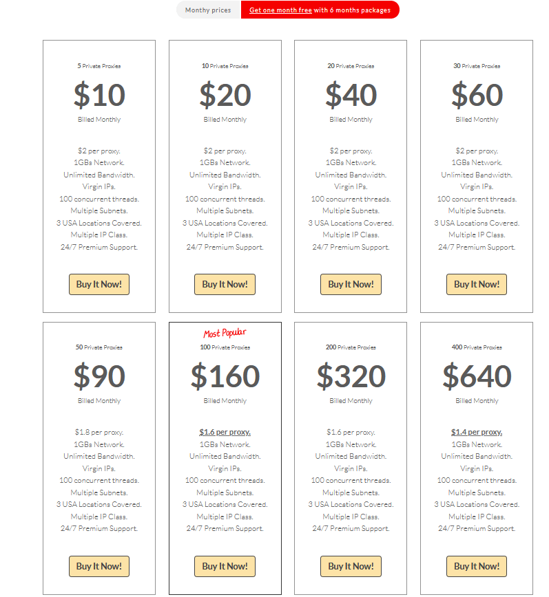 | 30 Proxies | $2.00 | $60.00 | 1GB/s Network, Unlimited Bandwidth, 100 Concurrent Threads, 3 USA Locations, Multiple Subnets, Multiple IP Class, 24/7 Support |