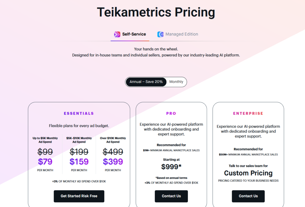 | Pro | Starting at $999* | +3% of monthly ad spend over $10K, annual terms | $1M+ minimum annual marketplace sales |