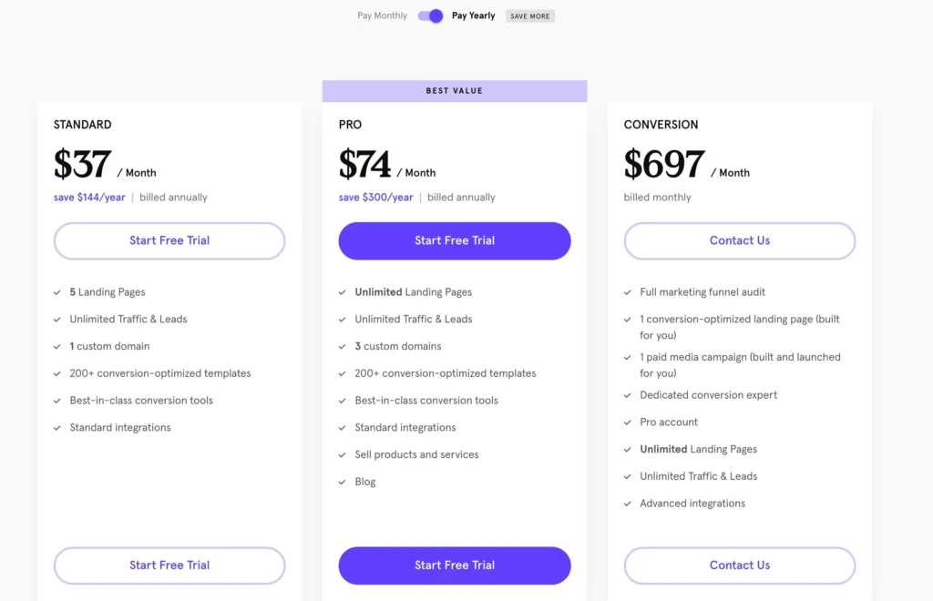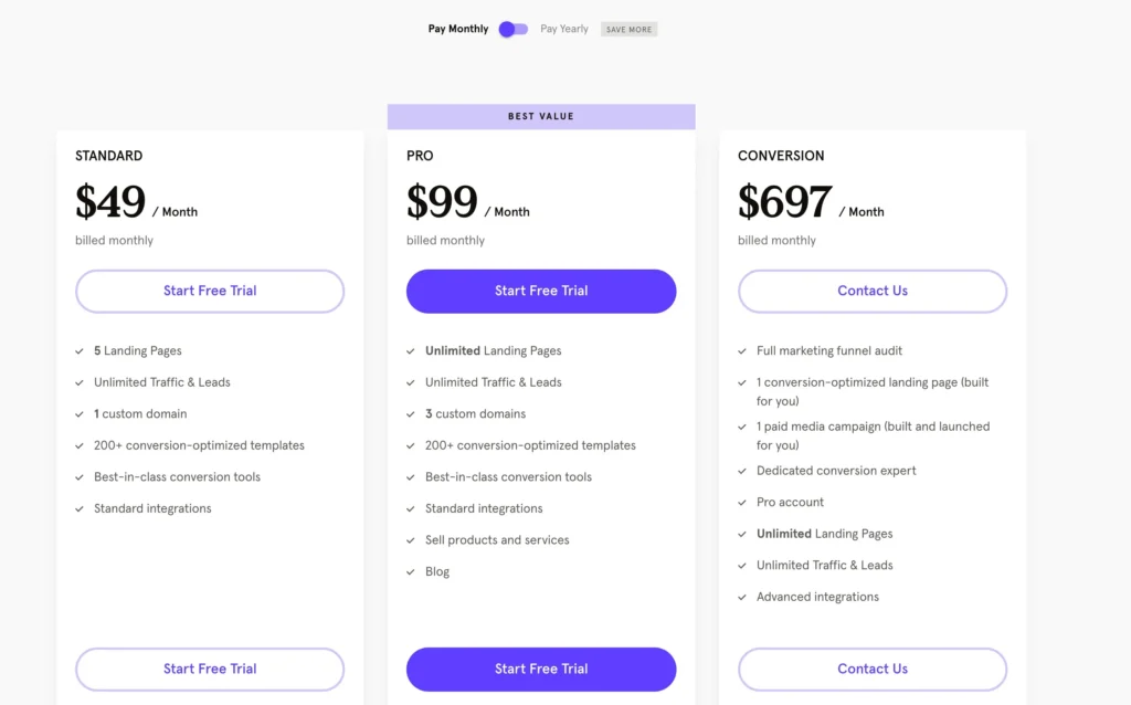 Unbounce offers a limited number of pages for those who purchase their higher-priced plans, whereas Leadpages allows you to create an unlimited number.