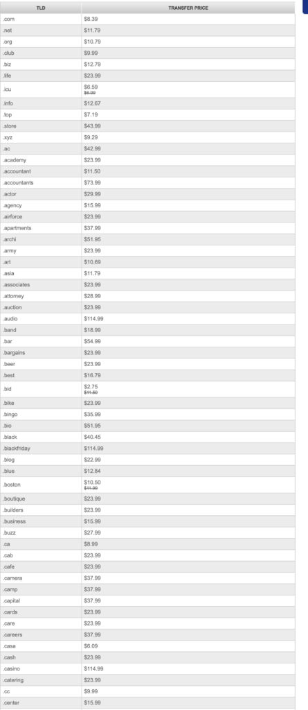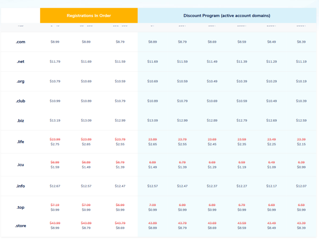PRICE: Traditional TLDs start with an amount of $8.99 per year with privacy and no hidden costs or yearly price hikes. Pricing of new gTLDs varies from the other ones. Discounts are only for bulk customers not for one or two.