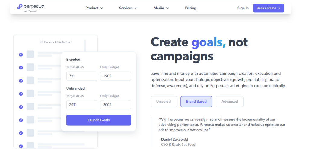 Perpetua allows you to define high-level campaign goals such as sales growth, profit optimization, or brand awareness. The platform then automatically builds and manages your Amazon (or Walmart, Instacart, etc.) ad campaigns using machine learning. This means you don’t need to manually manage keyword targeting, match types, or bid settings.